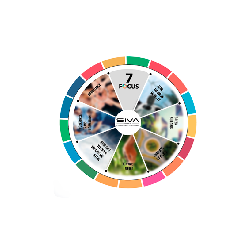 A estratégia de sustentabilidade da SIVA|PHS está alinhada com a visão Evoluir 2030 da Porsche Holding Salzburg, focando-se nas dimensões ambiental, social e de governança, com o objetivo de reduzir a pegada ecológica através de soluções e ações inovadoras.